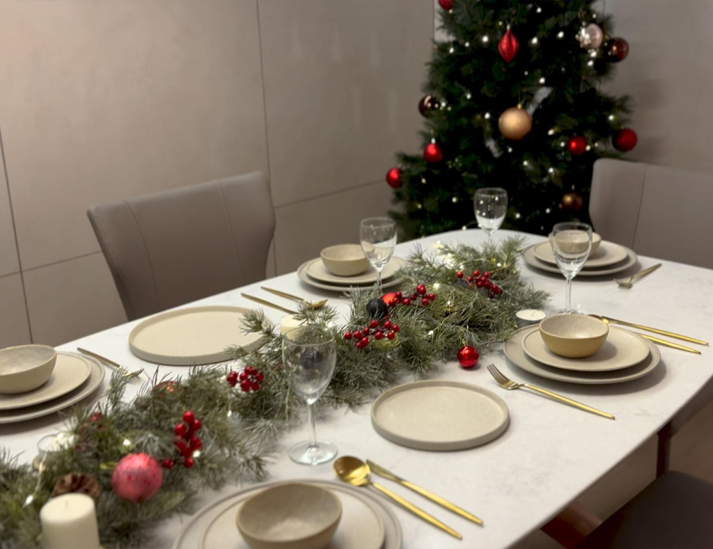 Momen liburan identik dengan makan bersama keluarga, sehingga meja makan layak menjadi area yang diberi perhatian khusus. Mulailah dengan taplak meja bernuansa lembut, kemudian susun peralatan makan secara rapi. Tambahkan centerpiece berupa tanaman hijau, rangkaian bunga, atau lilin dekoratif untuk menciptakan tampilan mewah namun tetap nyaman.