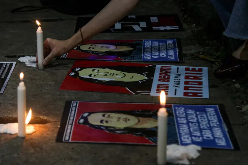 Aktivis menyalakan lilin dalam aksi solidaritas doa bersama untuk Andrie Yunus di depan Kantor Komnas HAM (Antara)