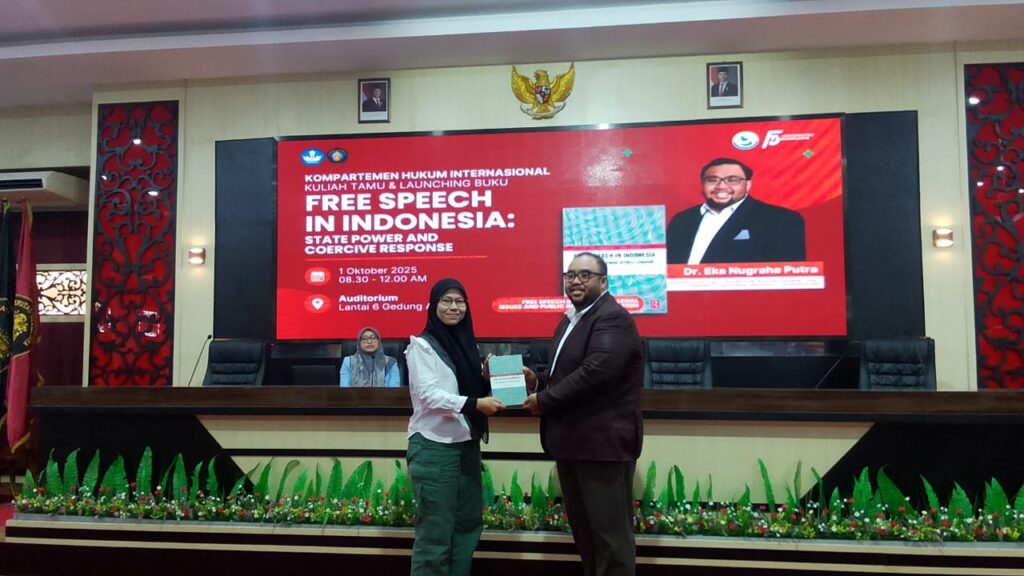 Dr. Eka menyoroti adanya ketegangan antara hukum nasional dan standar HAM internasional, serta kasus-kasus pelanggaran seperti pembatasan demonstrasi dan hilangnya aktivis. Pemaparan ini disampaikan dalam Kuliah Tamu & Launching Buku Free Speech in Indonesia: State Power and Coercive Response yang digelar Kompartemen Hukum Internasional FH UB pada Rabu (1/10/2025) di Auditorium Lantai 6 Gedung A.