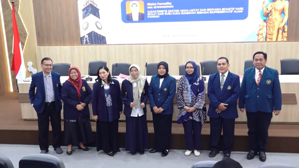 Sementara itu, promovenda Riska Faradila menjelaskan bahwa penelitiannya berfokus pada isolasi bakteriosin dari susu kuda Sumbawa sebagai alternatif pengawet alami. Ia menerangkan bahwa bakteriosin tersebut diharapkan dapat menggantikan bahan pengawet sintetis dan mendukung program ketahanan pangan nasional melalui pengembangan biopreservasi berbasis bahan alami.
