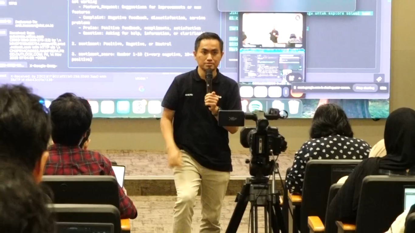 Workshop ini menghadirkan Ardi Ilmawan, CTO PT DOT Indonesia, sebagai narasumber utama. Ia membawakan materi mengenai pemanfaatan n8n, sebuah platform otomasi workflow yang memungkinkan pengguna membangun alur kerja (workflow) secara visual tanpa perlu menulis kode pemrograman.