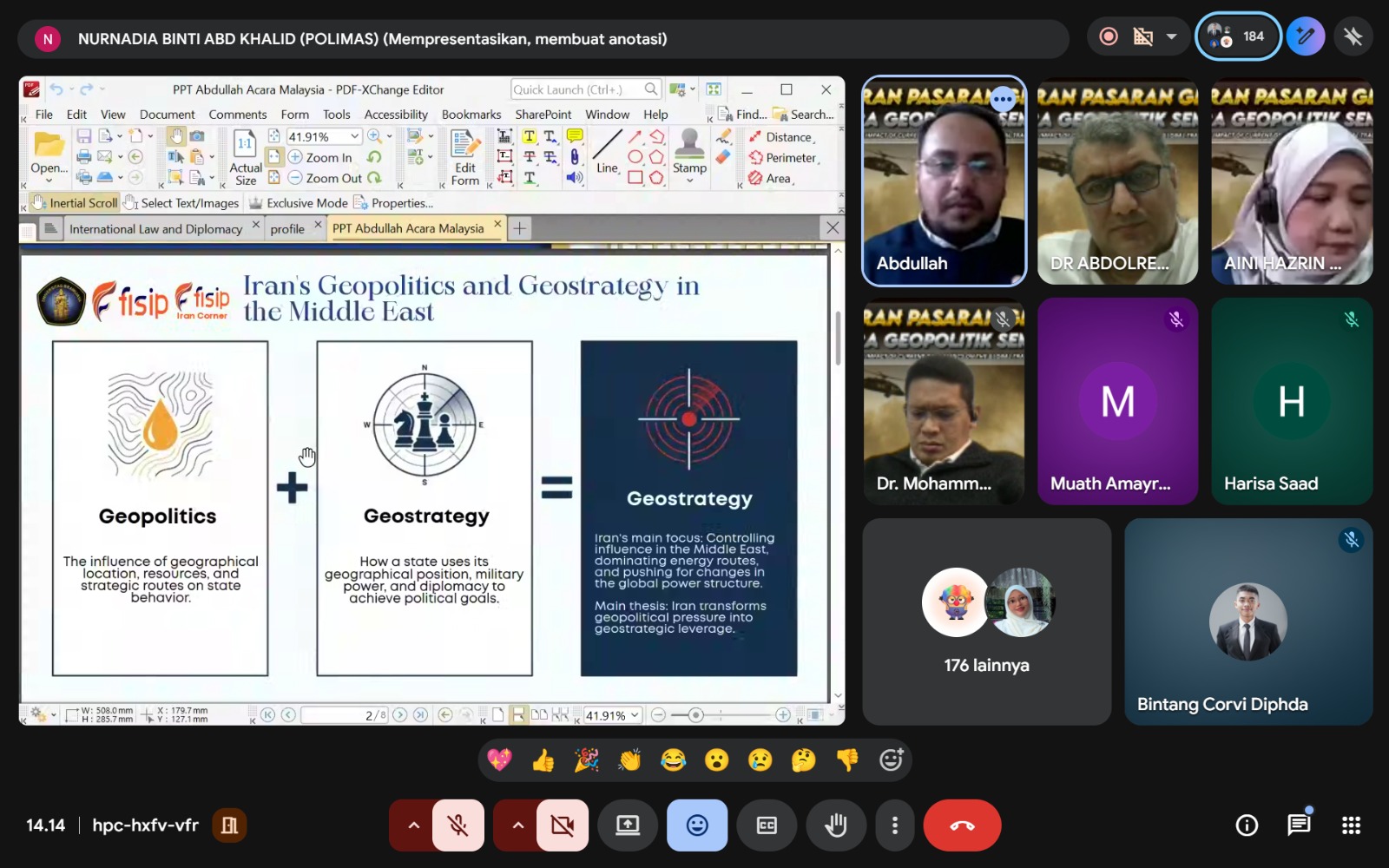 Dalam forum tersebut, Dr. Syed Abdullah Yahya Ibrahim dari Universitas Brawijaya, Indonesia, menegaskan bahwa posisi Iran di sekitar Selat Hormuz memberikan nilai strategis besar dalam percaturan global. Ia menjelaskan bahwa kedekatan dengan jalur vital perdagangan energi dunia membuat Iran mampu menciptakan leverage melalui pengelolaan tekanan geopolitik, termasuk dengan memanfaatkan ketidakpastian kawasan untuk memengaruhi stabilitas harga dan kebijakan global.
