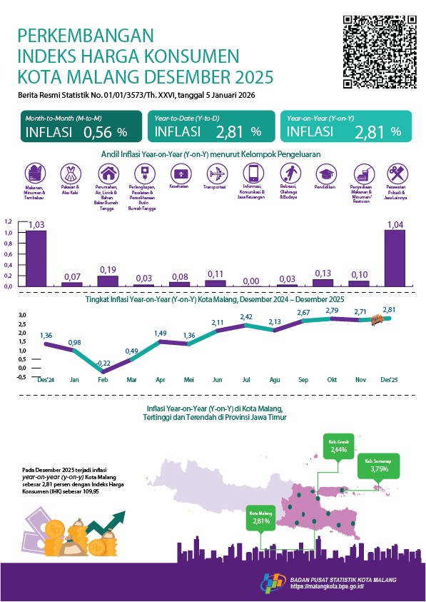 Berdasarkan rilis resmi BPS Kota Malang (5/1/2026), inflasi tahunan atau year-on-year (y-on-y) Kota Malang pada Desember 2025 tercatat sebesar 2,81 persen. Indeks Harga Konsumen (IHK) naik dari 106,94 pada Desember 2024 menjadi 109,95 pada periode yang sama tahun ini. Secara bulanan (month-to-month), inflasi tercatat 0,56 persen, sekaligus menjadi inflasi tahun kalender 2025.