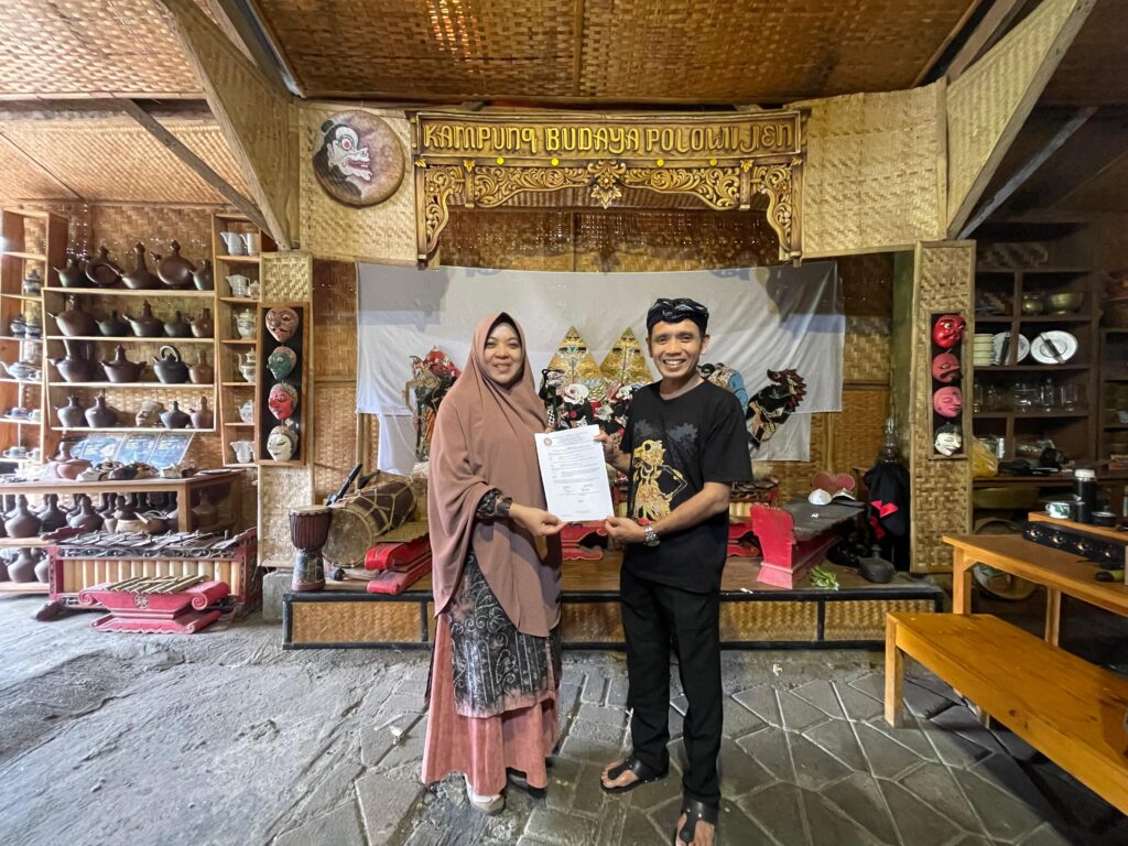 Penyerahan hasil riset tentang pengembangan video naratif dua bahasa secara simbolis kepada Isa Wahyudi atau Ki Demang, penggagas Kampung Budaya Polowijen Kota Malang (Ist.)