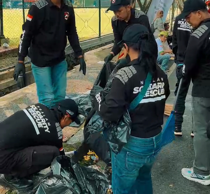 Relawan tersebut dibagi dalam beberapa kelompok kecil mengambil dan mengumpulkan sampah sisa makanan, bungkus makanan untuk dikumpulkanagar lokasi kembali bersih.