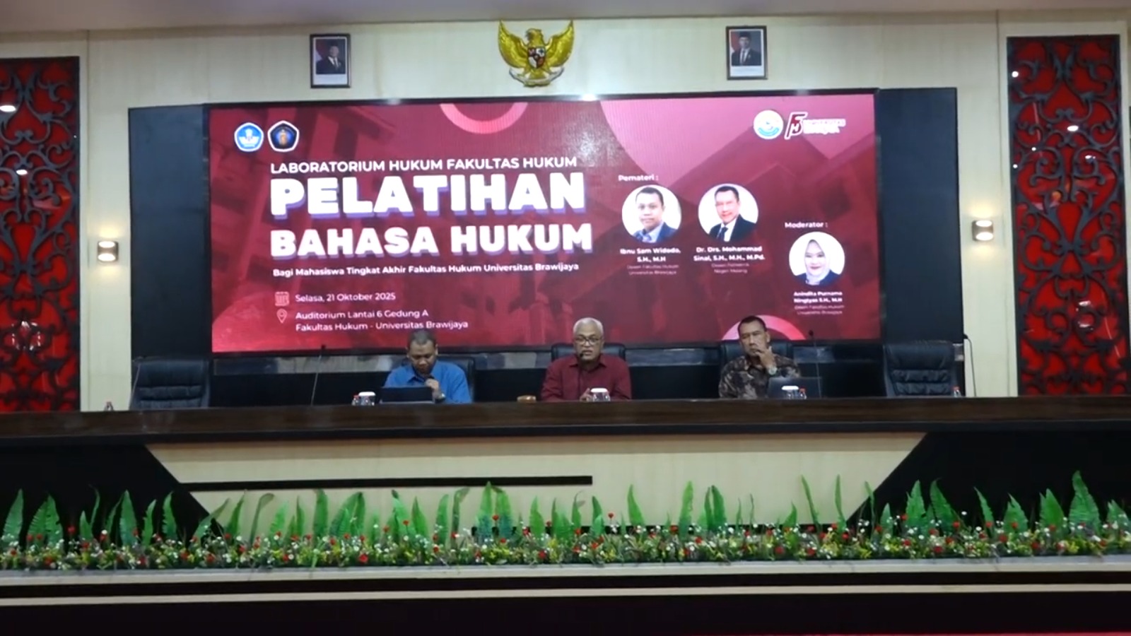 Kanal24, Malang — Sebagai upaya memperkuat pemahaman mahasiswa terhadap ragam bahasa hukum yang menjadi dasar dalam praktik profesi hukum, Laboratorium Hukum Fakultas Hukum Universitas Brawijaya (FH UB) menyelenggarakan Pelatihan Bahasa Hukum di Auditorium lantai 6 Gedung A FH UB pada Selasa (21/10/2025). Kegiatan ini dihadiri ratusan mahasiswa yang antusias mendalami penggunaan bahasa hukum secara tepat dan profesional. Acara dibuka secara resmi oleh Dekan FH UB, Dr. Aan Eko Widiarto, S.H., M.Hum, serta menghadirkan dua narasumber ahli, yaitu Dr. dr. Muhammad Sinal, S.H., M.H., M.Pd. dari Politeknik Negeri Malang dan Ibnu Sam Widodo, S.H., M.H. dari Fakultas Hukum UB.