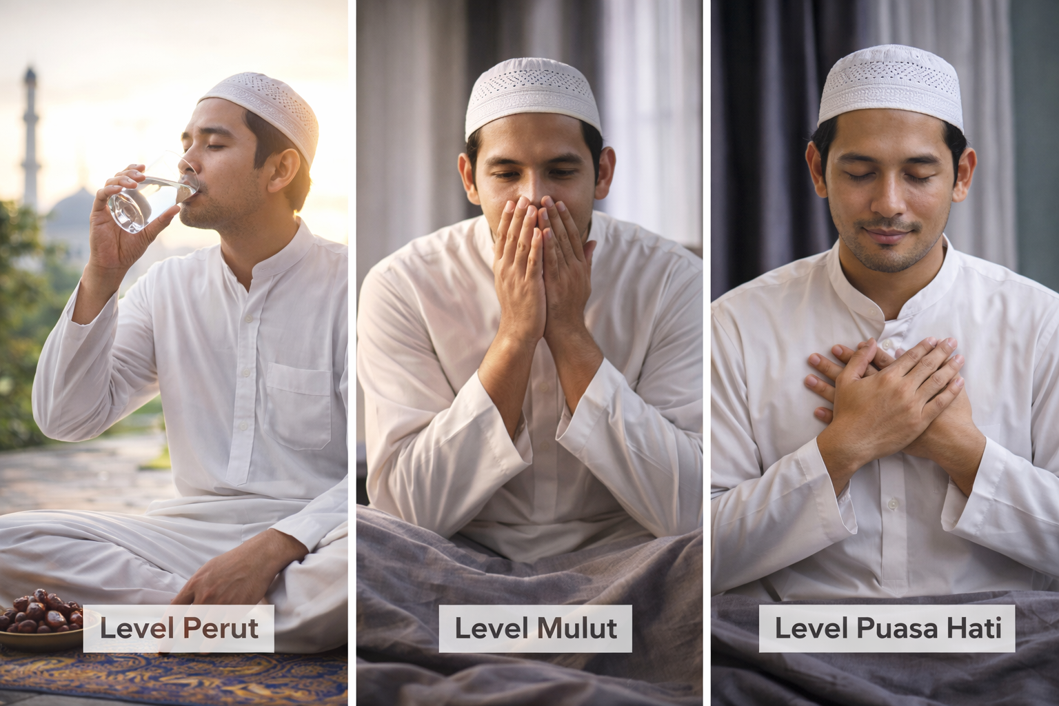 Mari kita evaluasi bagaimana melakukan level up dari puasa kita. Setidaknya ada tiga level dalam menjalani puasa dengan meminjam klasifikasi Imam al-Ghazali, antara lain: