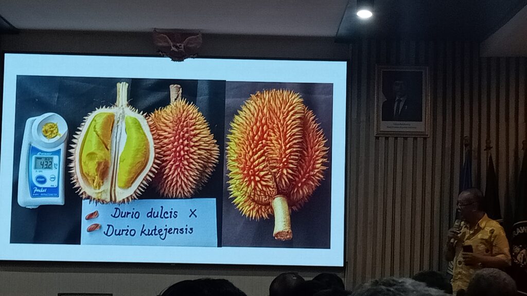 Hal yang sama juga disampaikan oleh Dr. Ir. Mohammad Reza Tirtawinata dari Yayasan Durian Nusantara yang memaparkan data bahwa Indonesia merupakan pemilik genotip durian terbesar di dunia.