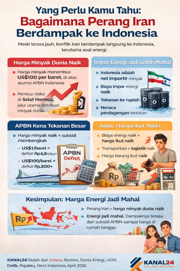 Kanal24, Malang – Konflik yang melibatkan Iran di Timur Tengah mungkin terasa jauh dari Indonesia. Namun dalam sistem energi global, jarak tidak lagi menjadi penghalang dampak. Gejolak di kawasan tersebut terbukti langsung memengaruhi harga energi, kebijakan negara, hingga kondisi ekonomi dalam negeri.
